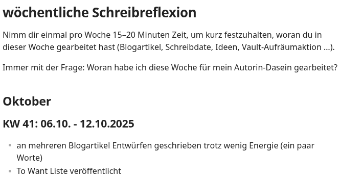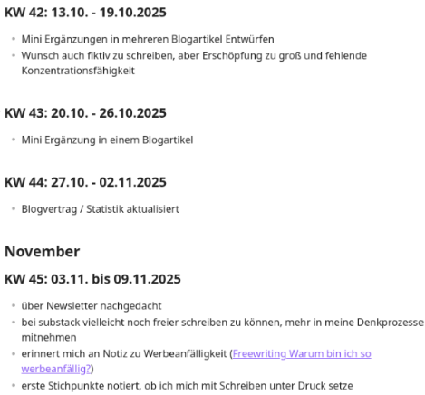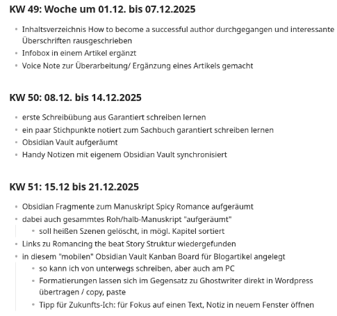 Nimm dir einmal pro Woche 15–20 Minuten Zeit, um kurz festzuhalten, woran du in dieser Woche gearbeitet hast (Blogartikel, Schreibdate, Ideen, Obsidian Vault aufräumen, …).